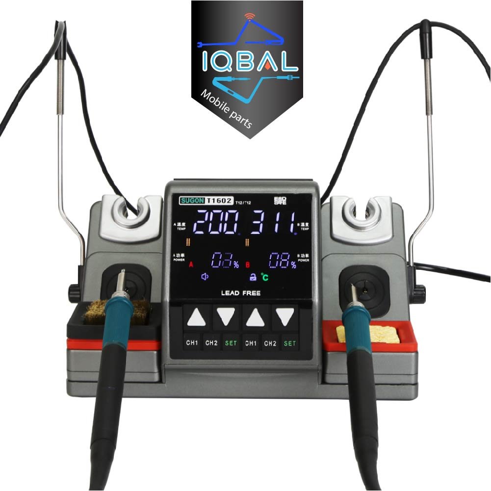 T1602 2-in-1 master-level soldering station with dual independent handles and A/B zone control. Supports simultaneous tip use without interference. Input AC110V/220V, 120W max power, 100–450°C range, LCD digital display. Ideal for repair shops, manufacturing, retail, and phone repair training. Package includes station, two T12 handles, three T12 tips, two holders, power cord.